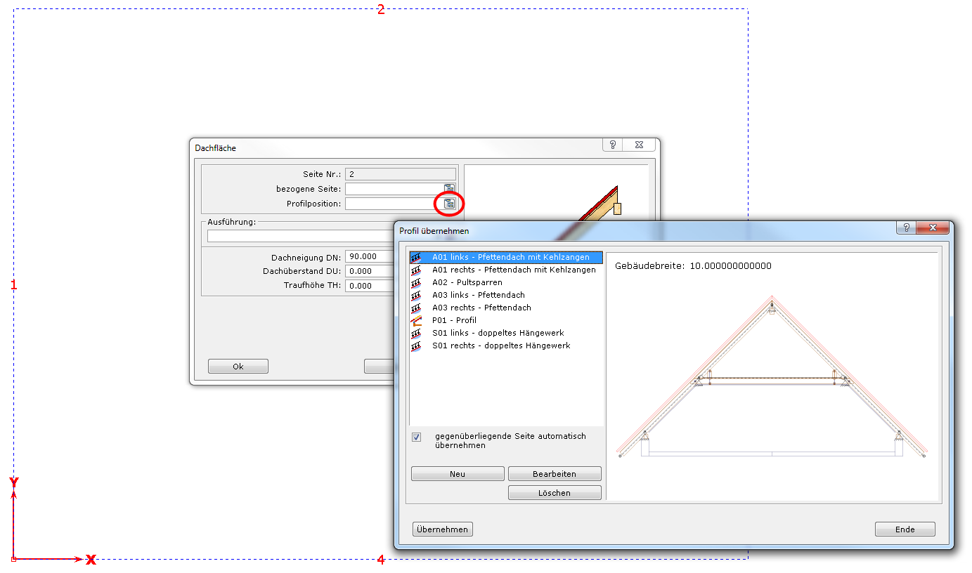 Im Dietrich’s Bauwerk können für  Dachausmittlungen neben Dietrich’s Profilpositionen auch „Dachpositionen“ aus der DC-Statik verwendet werden.