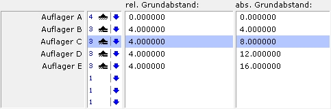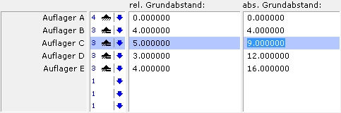 In den Positionsarten Durchlaufträger und Pfetten, Koppelpfetten werden die Auflager- und Knoteneingaben tabellarisch eingegeben. Dabei steht eine Spalte für den relativen Grundabstand und eine Spalte für den absoluten Grundabstand zur Verfügung. Die Werte für den relativen Grundabstand beziehen sich auf den vorherigen Knoten, wobei sich die Werte für den absoluten Grundabstand auf den Nullpunkt beziehen. Änderungen der jeweiligen Werte haben unterschiedliche Auswirkungen: