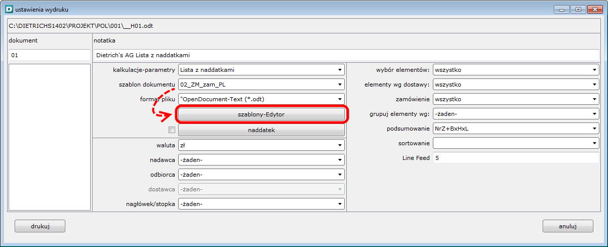 Narzędzie do tworzenia oraz edycji szablonów znajduje się w menu głównym programu pod komendą 3 programy – 4 szablony-Edytor. Dostępne wbudowane szablony zapisywane są w formacie DT3. Edycji szablonu możemy dokonać również podczas wydruku dokumentu z bazy klikając przycisk: