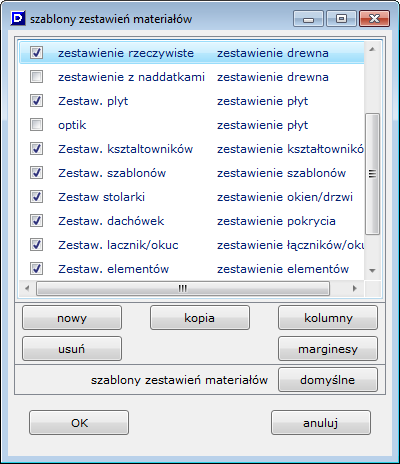 Opcja ***nowy*** tworzy czysty szablon zestawienia na podstawie jednego z 9 typów zestawień. Przycisk ***kolumny*** pozwala edytować wybraną pozycję. Przyciskiem ***marginesy*** możemy dopasować [okno wydruku](https://docs.dietrichs.com/dietrichs-intelligent-documentation/docs-pol/projekt-3d-cad_cam/konstruktionsprogramm_projekt-3d-cad_cam/listen_zestawienia-obmiary/wydruk-listy-materialowej) indywidualnie do każdego wybranego szablonu. Przycisk ***usuń*** kasuje wskazaną pozycję. Wybierając opcję ***domyślnie*** możemy przywrócić oryginalne ustawienia szablonów zapisanych w programie.