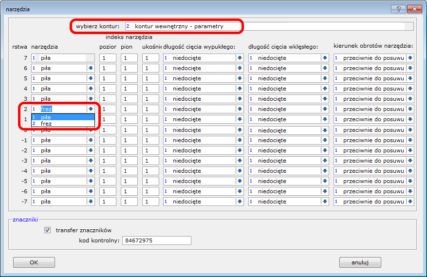 Do dyspozycji mamy: frez lub piłę. Ustawienia dla konkretnej warstwy znajdują się w oknie “***narzędzia***” (2-1). Występuje tu rozgraniczenie na kontury wewnętrzne i zewnętrzne prefabrykatu: