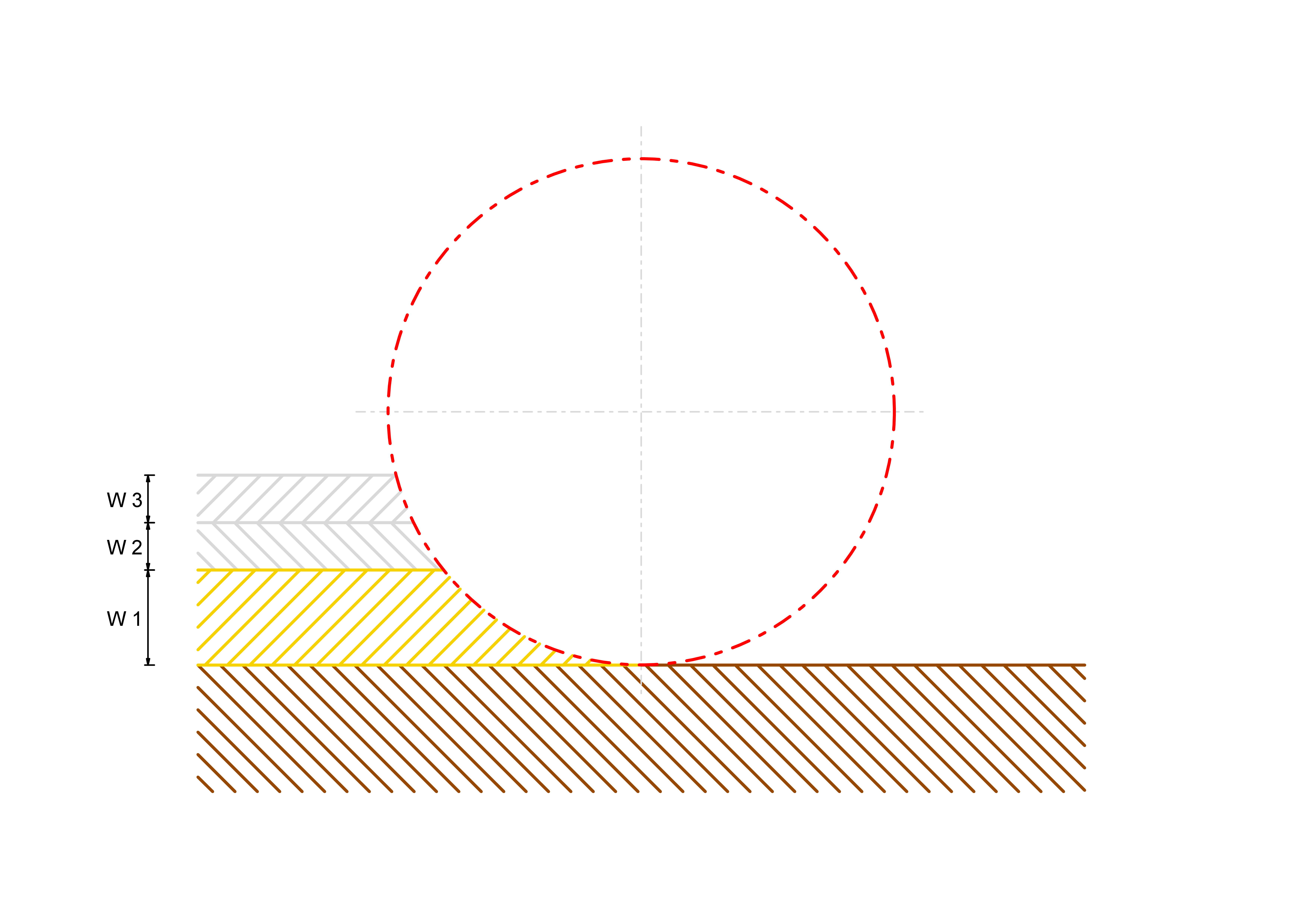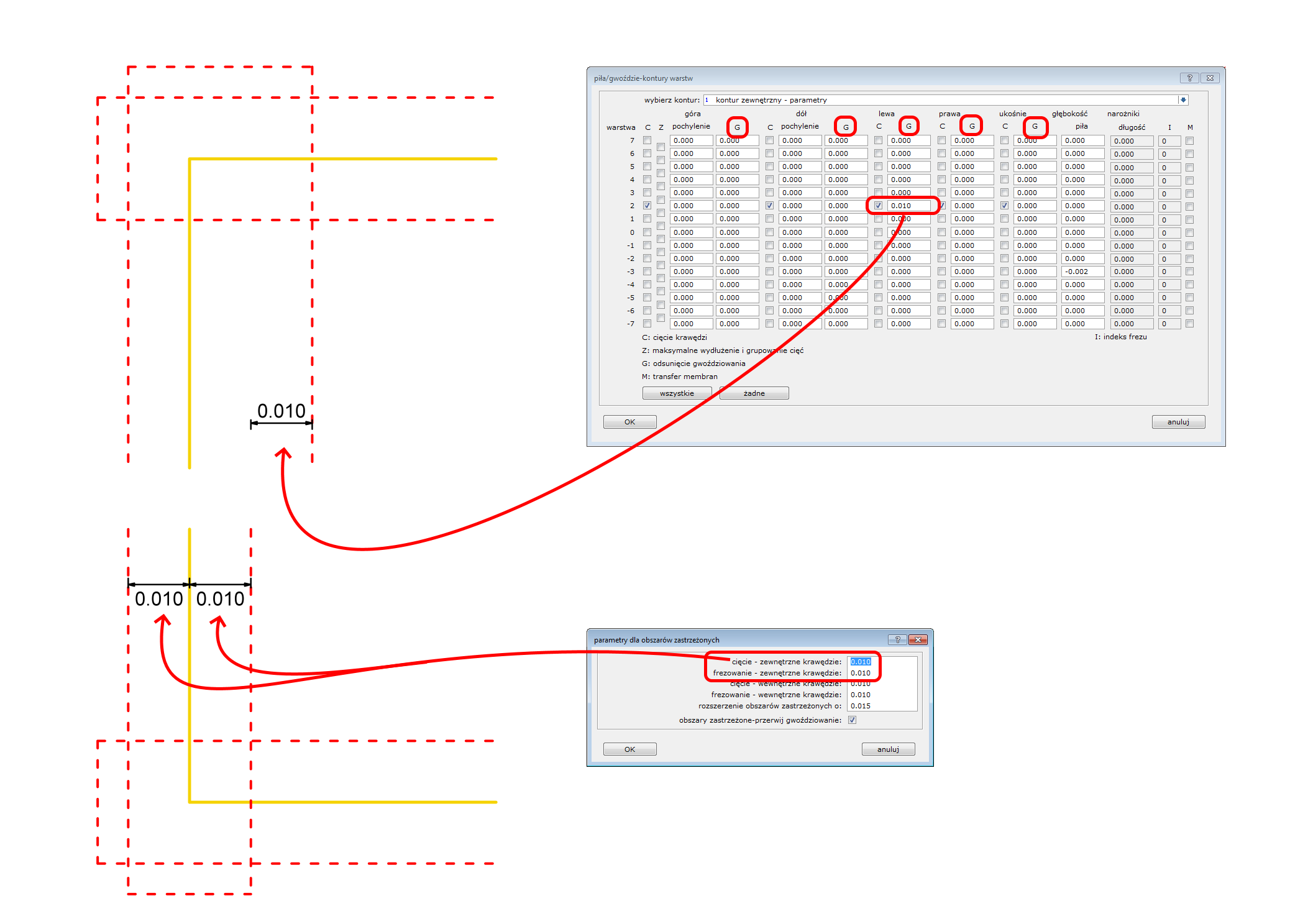 * **rozszerzenie stref ochronnych** - opcja dostępna w oknie “***piła/gwoździe-kontury warstw***” (2-3). W kolumnie “***G***” można podać wartość dodatkowego poszerzenia strefy ochronnej linii cięcia. Poszerzenie następuje tylko w kierunku wnętrza prefabrykatu i dostępne jest tylko dla zewnętrznych jego konturów. Wartość jest dodawana do ustawień zawartych w oknie “***obszary zastrzeżone***” (2-4):