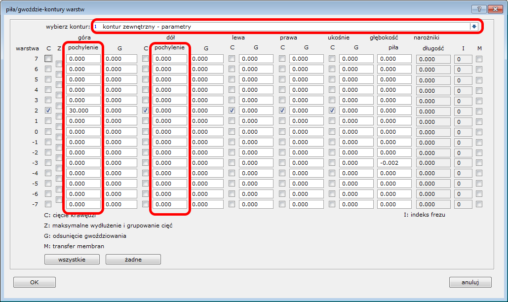 * **zmiana głębokości cięcia** - opcja dostępna w oknie “***piła/gwoździe-kontury warstw***” (2-3). W kolumnie “***głębokość cięcia***” należy podać o ile narzędzie skrawające (piła lub frez) ma zwiększyć (+) lub zmniejszyć (-) swoją głębokość cięcia. Wartość 0.0 to zagłębienie narzędzia na pełną grubość danej warstwy. Zmiana głębokości jest wspólna dla konturów wewnętrznych i zewnętrznych oraz wszystkich [typów linii](https://docs.dietrichs.com/dietrichs-intelligent-documentation/docs-pol/projekt-3d-cad_cam/konstruktionsprogramm_projekt-3d-cad_cam/maschinenuebergabe_maszyny/obrobka-konturow-na-moscie-wielofunkcyjnym-2) w obrębie jednej warstwy.