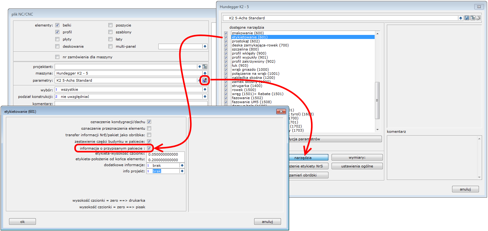 Zależnie od typu maszyny standardowe ustawienia postprocesora mogą nie zawierać wytycznych do generowania informacji o pakietach. W takim przypadku należy zwrócić uwagę na ustawienia narzędzi etykietujących w zakładce “narzędzia” postprocesora.