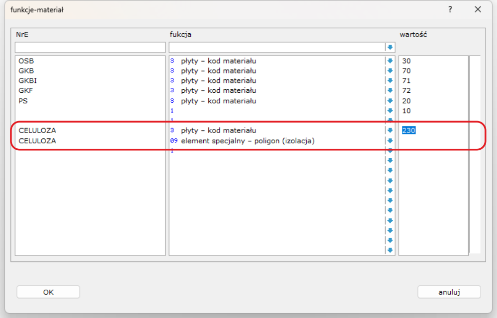 Dla materiału zdefiniowanego w projekcie należy przypisać właściwą funkcję: