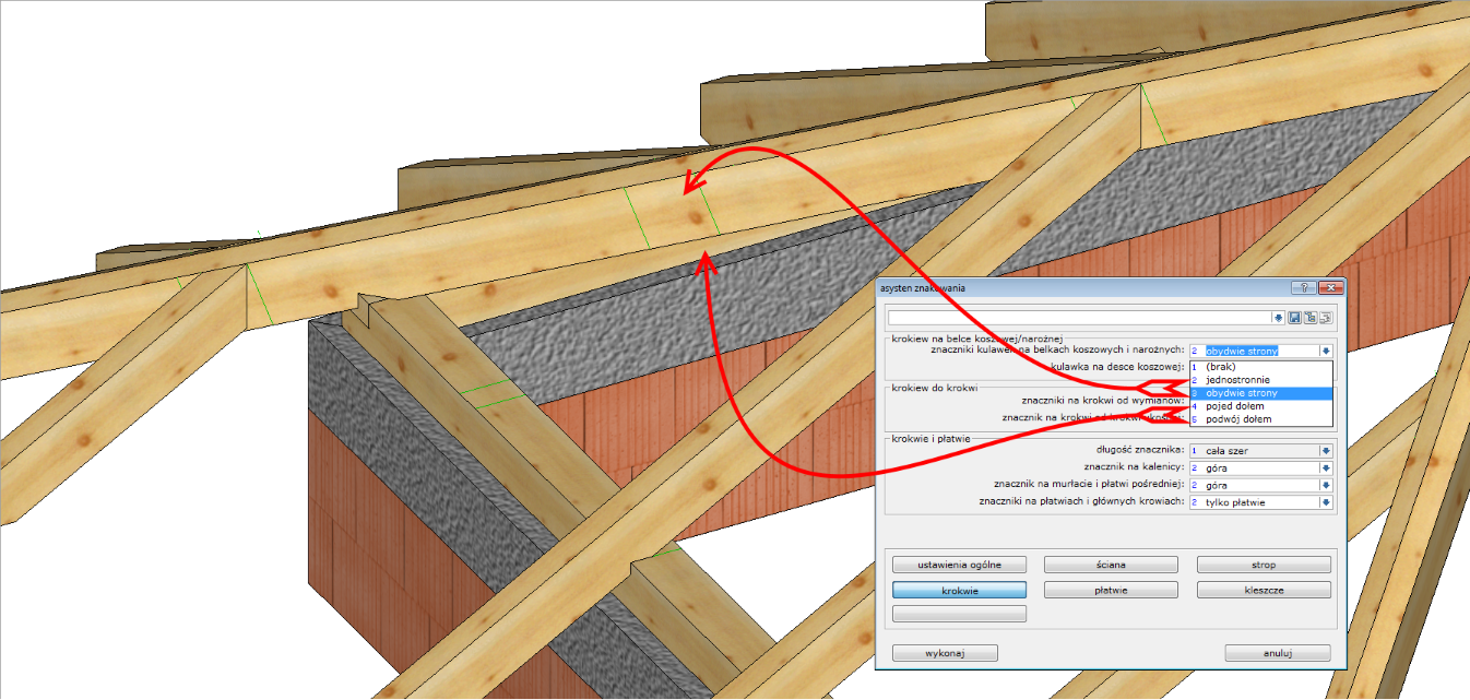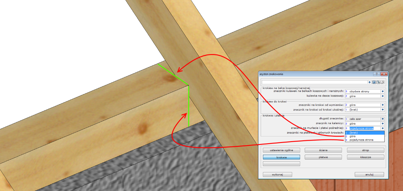 Krokwie są najliczniejszymi elementami w strukturze więźby dachowej. Ta część asystenta odpowiada za tworzenie znaczników na różnego typu elementach właśnie przez krokwie. Górna sekcja okna odpowiada za pozycje znacznika tworzonego przez kulawki na elementach typu krokiew narożna/koszowa czy deska koszowa: