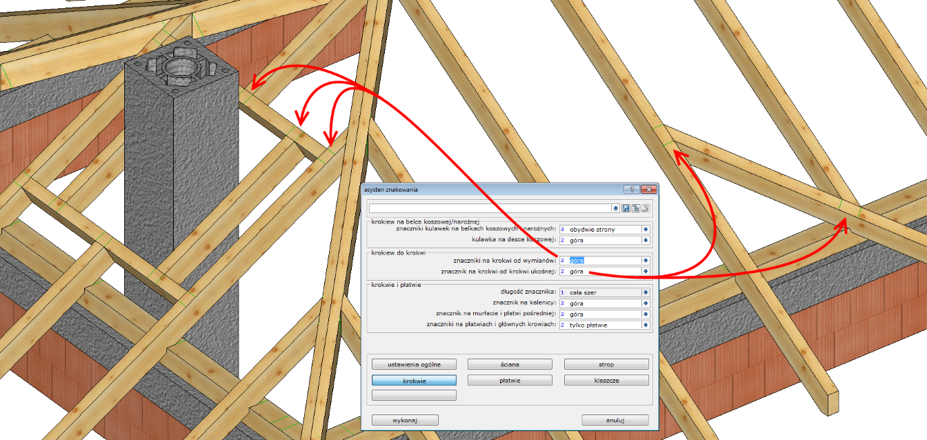 System może oznaczyć również pozycje wymianów lub krokwi ukośnych na podpierających je krokwiach: