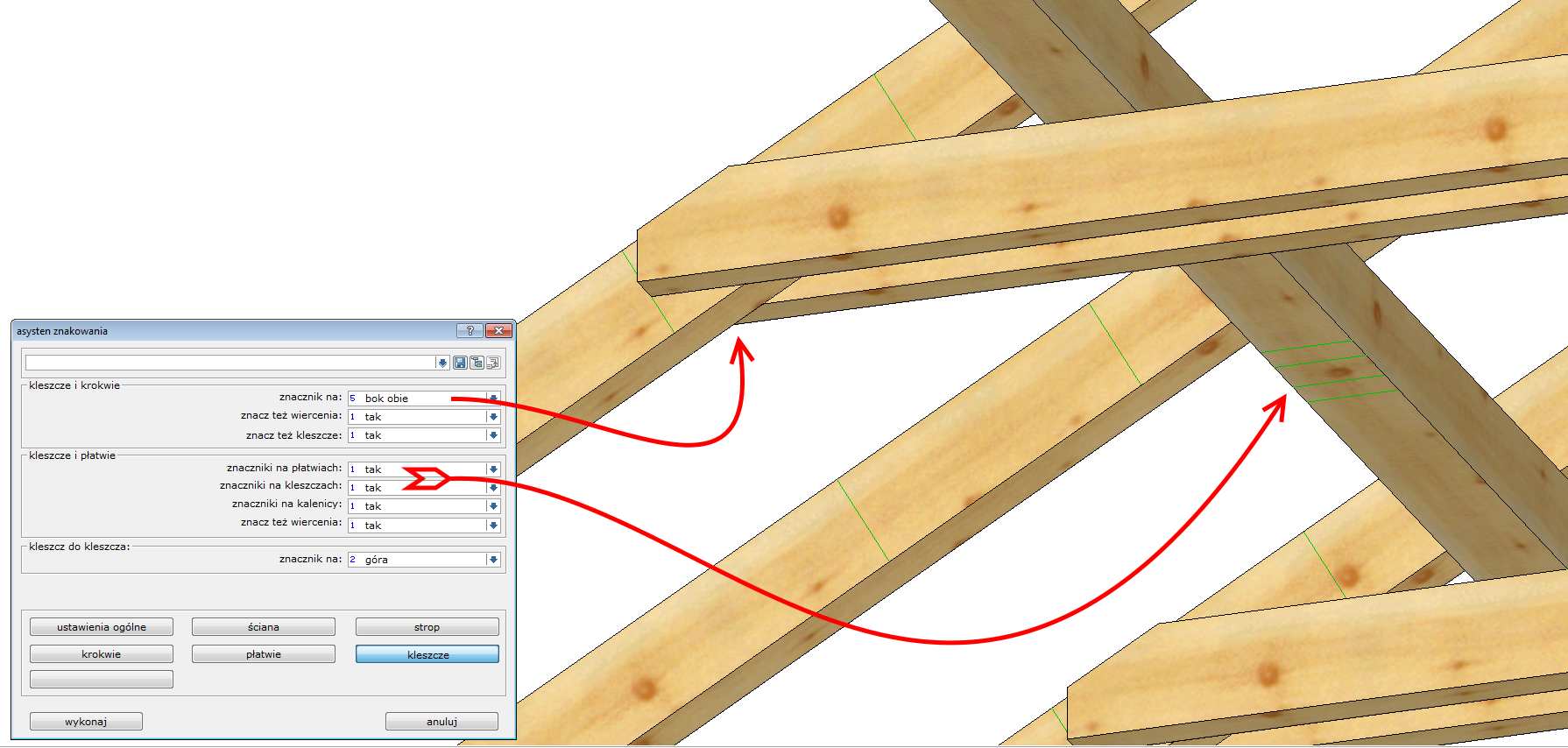 Zakładka kleszcze pozwala kontrolować znaczniki pozostawiane przez ten typ elementu na sąsiadujących belkach. Można tu wykreślić położenie najważniejszych połączeń kleszczy - z krokwią oraz płatwią: