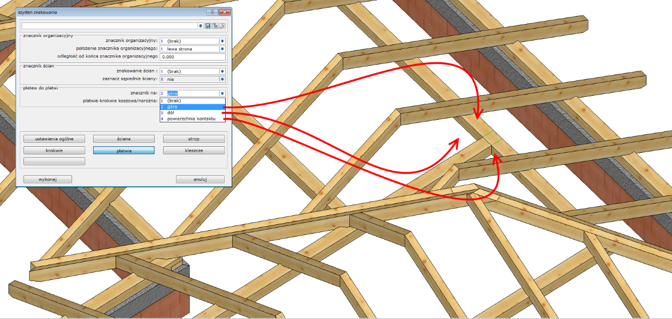 W tej części znajdują się ustawienia pozycji znaczników tworzonych przez płatwie na sąsiednich elementach. Pierwsza sekcja od góry to znacznik organizacyjny. Służy on poprawnemu orientowaniu płatwi składających się z kilku segmentów. Zapobiega to przypadkowej zamianie początku belki z jej końcem.\