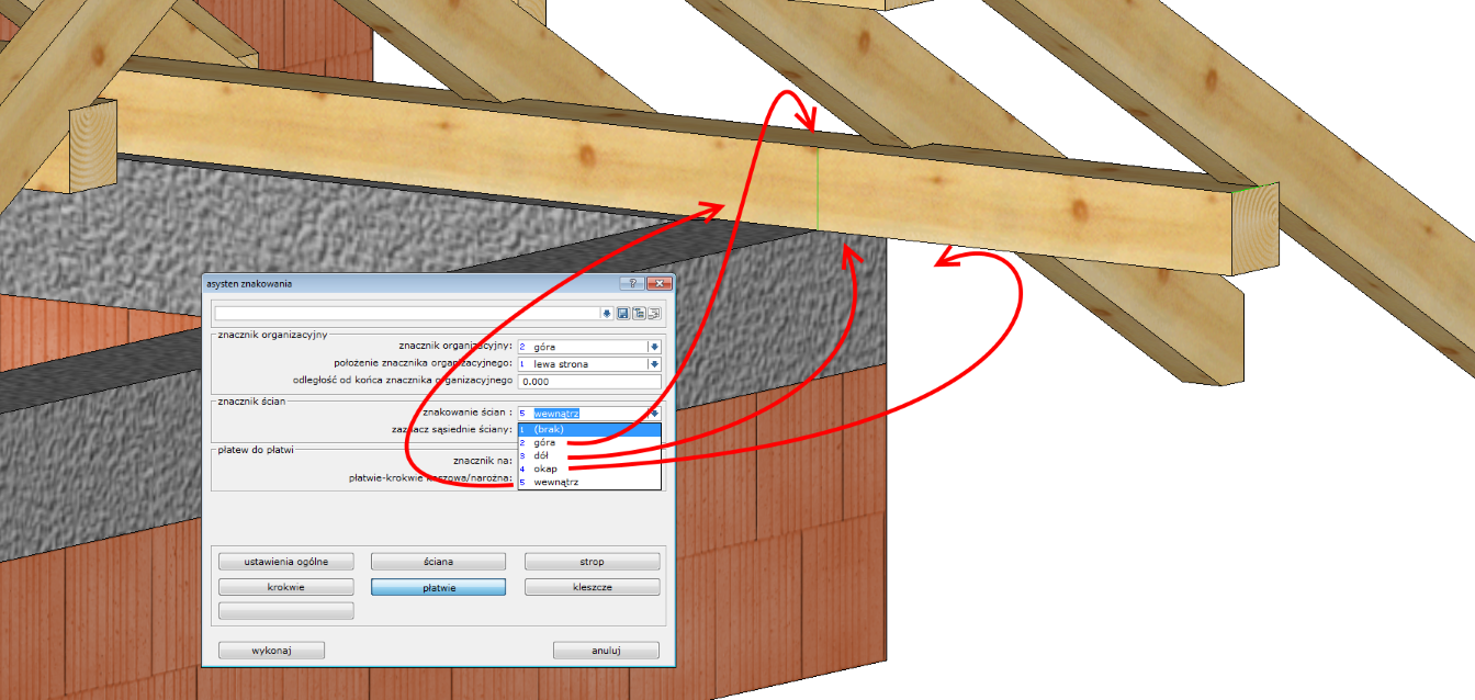 Możliwe jest również zaznaczenie krawędzi ściany na dowolnej stronie płatwi: