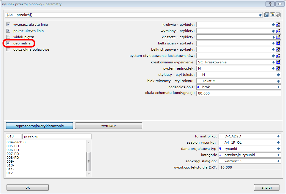 Każdy przekrój, również ten wzbogacony o dodatkowe elementy rysunkowe można zapisać jako rysunek D-CAD a następnie wydrukować. Eksport do środowiska D-CAD możemy przeprowadzić dwoma sposobami. Zapis rysunku funkcją 1 plik – 01 rysunki – 8 rysunek-przekroje/widoki (lub 6 rysunek-widok D-CAM) daje możliwość kontroli nad wieloma parametrami rysunku w zależności z jakiego modułu jest generowany. Aby znalazły się na nim wszystkie dodatkowe elementy rysunkowe, które wprowadziliśmy należy pamiętać o zaznaczeniu opcji geometria.