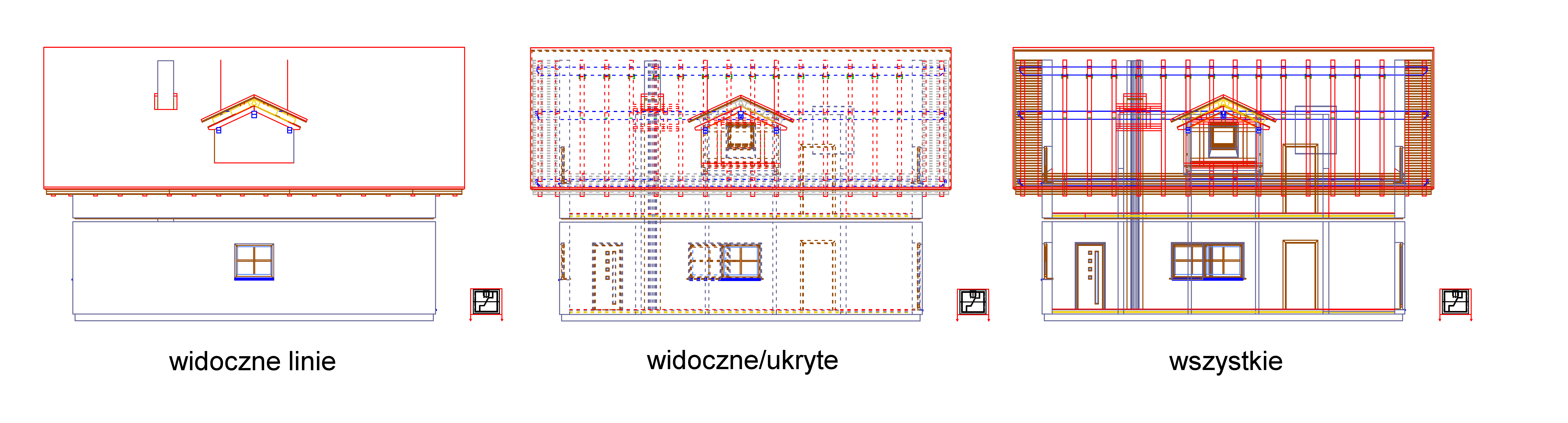 widoczne/ukryte - wszystkie linie zasłaniane przez elementy znajdujące się z przodu widoku/przekroju będą wyświetlane linią przerywaną