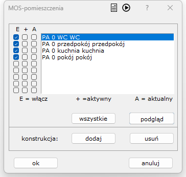 Wymaga tworzenia pomieszczeń odpowiednimi narzędziami w module ŚCIANA