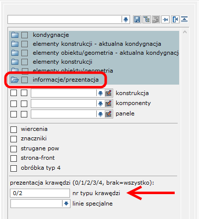 Każdy typ krawędzi oraz sylwetka posiada swój identyfikator: 0, 1, 2, 3.... Wybór identyfikatora skutkuje wyświetleniem adekwatnej krawędzi lub sylwetki. Dozwolony jest wybór wielokrotny 0/1/2 jak również 0/2.