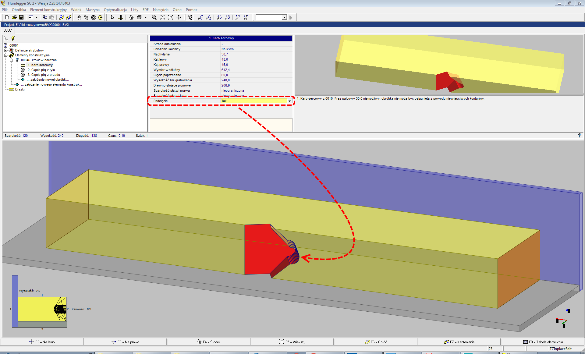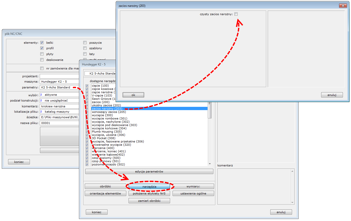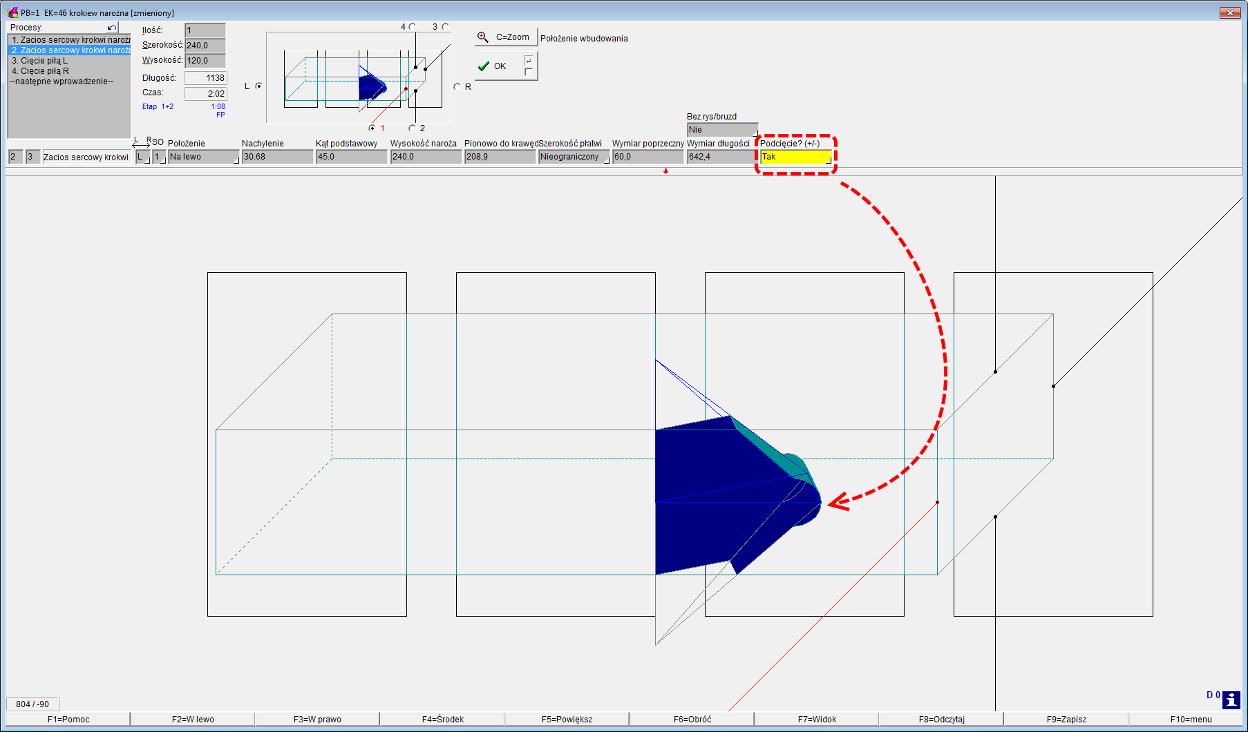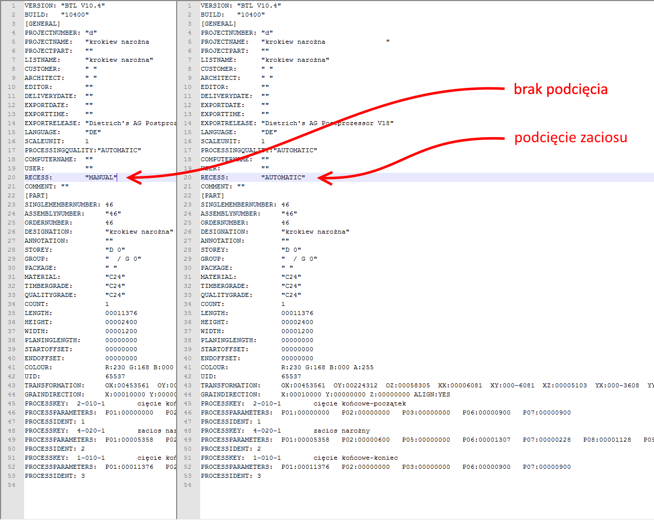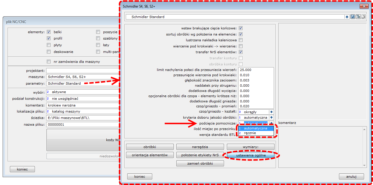 W plikach sterujących do wersji ***BTL*** ***10.2*** nie ma możliwości wykonania dodatkowego podcięcia zaciosu krokwi narożnej. Od wersji ***BTL*** ***10.2*** programiści wprowadzili taką opcję globalnie dla całego pliku BTL (wszystkich zaciosów w danym programie).  Sterowanie tym parametrem możliwe jest z poziomu postprocesora Dietrich’s dla tych maszyn np.: