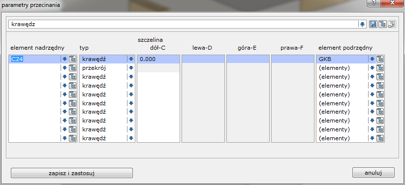 Ta sama funkcja może być wywołana z module D-CAM **2 edycja – 02&#x20;*****parametry przecinania***. Tutaj jej działanie obejmuje cały model konstrukcji. To oznacza, że wszystkie elementy napotkane przez element nadrzędny zostaną obrobione.\