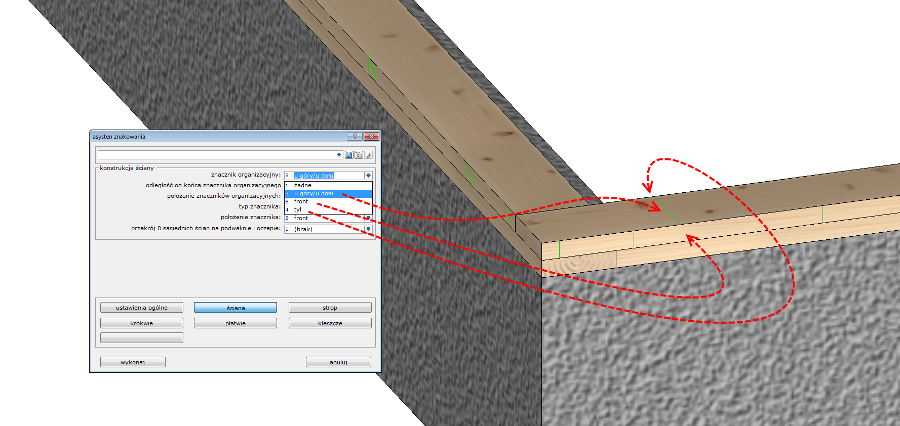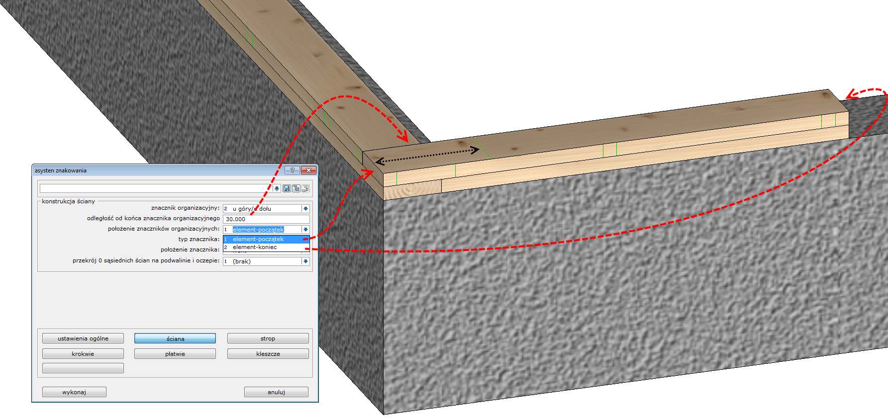 Dodatkową opcją jest oznaczenie miejsca styku warstwy 0 sąsiedniej ściany. Znacznik tworzony jest na podwalinie i oczepie ściany niezależnie od tego czy ściana dochodząca posiada elementy konstrukcyjne