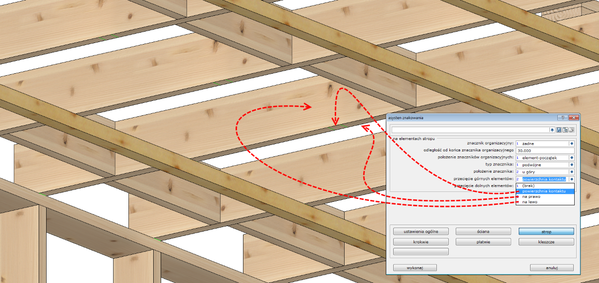 Pakiet opcji znakowania elementów konstrukcyjnych stropu zawiera podobne funkcje jak w przypadku ścian. Każdą belkę stropową można opatrzyć znacznikiem organizacyjnym tak by początek wszystkich belek był po tej samej stronie domu.