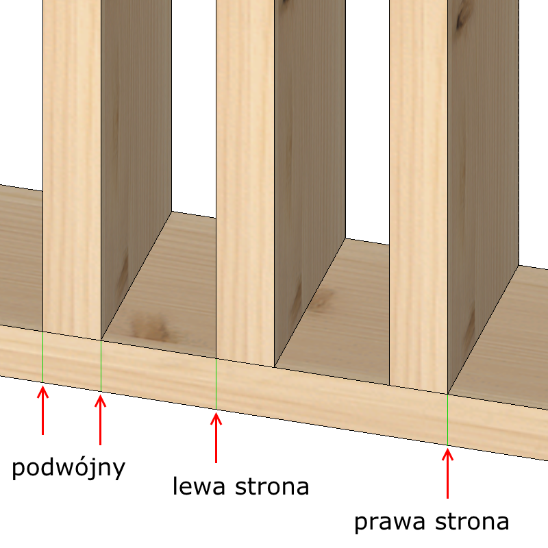Oznaczenie elementów takich jak łaty sufitu, podciągi czy legary podłogi wymaga podania jedynie miejsca wykonania znacznika na elemencie górnym bądź dolnym: