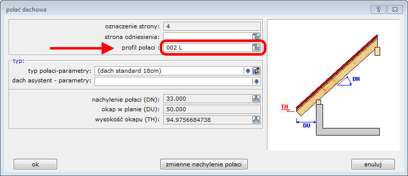 Ustawienia niezbędne do konstrukcyjnej obudowy otworu - opisane w osobnym [*artykule tutaj*](https://docs.dietrichs.com/dietrichs-intelligent-documentation/docs-pol/projekt-3d-cad_cam/konstruktionsprogramm_projekt-3d-cad_cam/modellbereiche_model-3d/dach_dach/okno-polaciowe-wymiany)