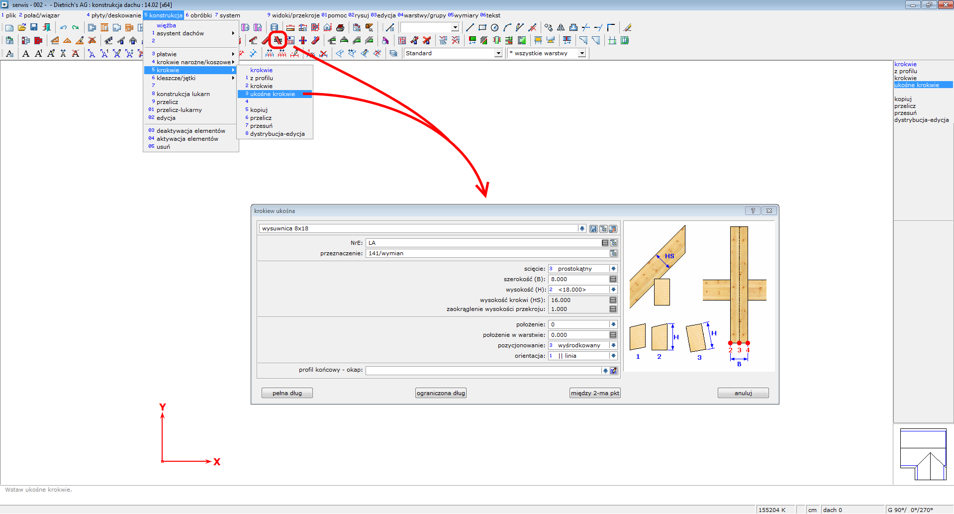 W systemie Dietrich’s nie występuję specjalna funkcja dedykowana dla wysuwnicy . Dlatego do tego celu należy wykorzystać inne dostępne możliwości. Świetnie do tego celu nadają się takie elementy jak **5 konstrukcja – 5 krokwie – 3&#x20;*****ukośne krokwie***.