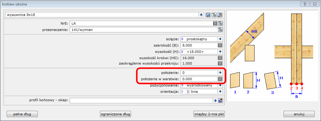 W kolejnym kroku definiujemy wymiary wysuwnicy: jej wysokość oraz szerokość. Należy pamiętać aby wstawić wysuwnice we właściwej warstwie dachu. Do kontroli tych parametrów służą funkcje ***położenie*** oraz ***położenie w warstwie***.