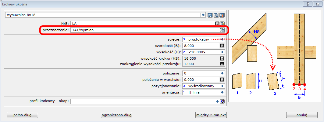 Definicję wysuwnicy rozpoczynamy od zmiany przeznaczenia elementu. Aby element opisać prawidłowo wprowadzany własny opis – *wysuwnica*. Poprzedni wpis w tym polu jest generowany na podstawie pola elem typ, lecz można go modyfikować według własnych potrzeb. Aby zachować prostokątny przekrój wysuwnicy i dopasować jej ustawienie do płaszczyzny dachu należy w opcji ścięcie wybrać opcję ***3 – prostokątny***.