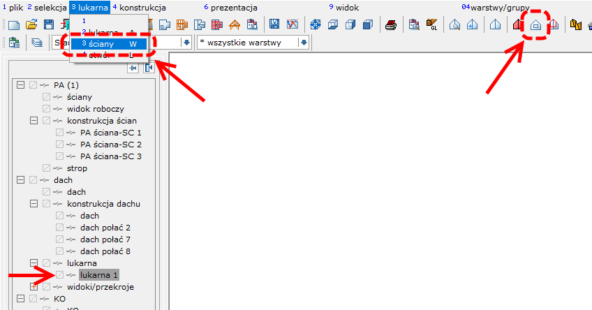 * ***ściana lukarny*** - ściana lukarny przypisana jest do kondygnacji. Jej wysokość oraz dolna krawędź definiowana jest automatycznie przez połacie dachu głównego i lukarny.