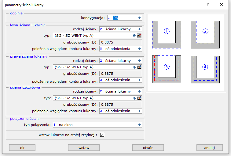* ***położenie względem konturu lukarny*** – określa sposób lokalizacji ściany: