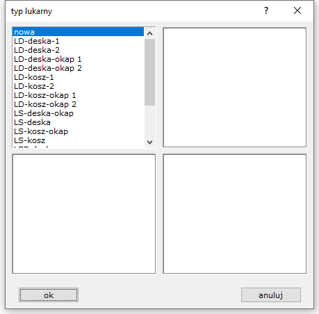 Jeśli lista szablonów lukarn nie zawiera takiego typu, który interesuje użytkownika należy wybrać pierwszą pozycję na liście szablonów - nowa. Na ekranie pojawi się okno typ lukarny.