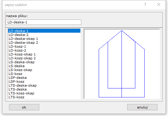 Szablon lukarny można zrobić z aktualnie edytowanej lukarny. Uruchomienie komendy ***1 plik → 3 szablon → 1 zapisz*** w module **KONSTRUKCJA LUKARN** spowoduje wywołanie okna "zapisz szablon". Okno składa się z listy zdefiniowanych szablonów, okna podglądu oraz pola nazwa pliku.