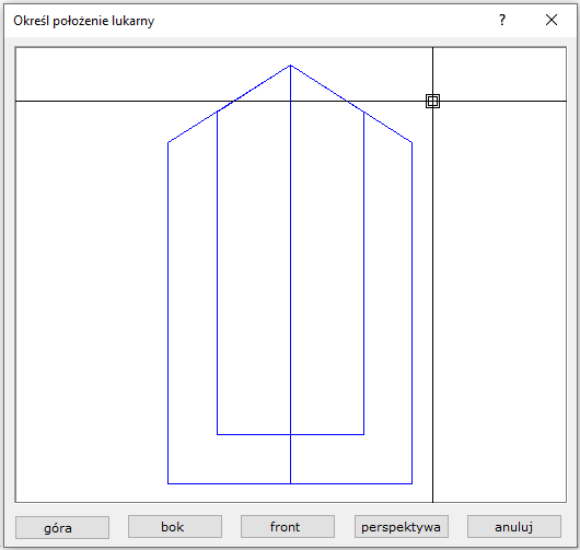 Okno graficzne służy do wyboru punktu determinującego położenie lukarny. Za pomocą tego punktu zostanie określone położenie lukarny w modelu. Lewym przyciskiem myszy wskazujemy właściwy punkt.