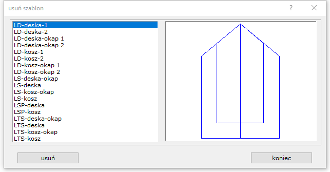 Użytkownik może zarówno definiować nowe szablony lukarn jak również usuwać zbędne. Uruchomienie komendy ***1 plik → 3 szablon → 2 usuń*** w module **KONSTRUKCJA LUKARN** spowoduje wywołanie okna usuń szablon rys nr 30. Okno składa się z listy zdefiniowanych szablonów, okna podglądu.