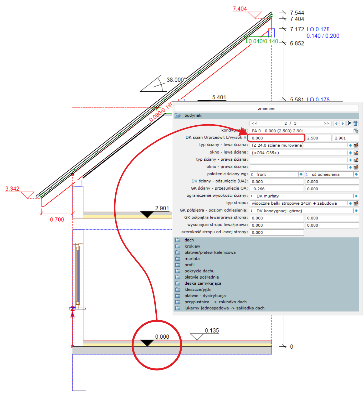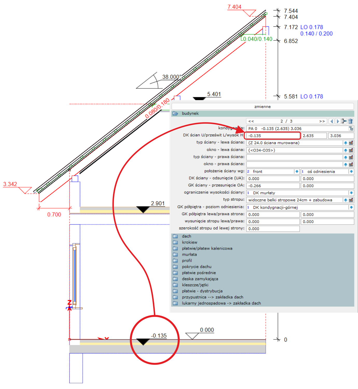 W celu obniżenia rzędnej posadzki z poziomu +0,135 modyfikujemy rzędną kondygnacji PA. Wartość wyjściową 0,0 zmieniamy na -0,135m. Wartość 0,135 to grubość warstw wykończeniowych stropu - płyta betonowa 18cm z zabudową 13,5cm. Metoda nie wymaga modyfikacji parametrów ani ściany, ani stropu.