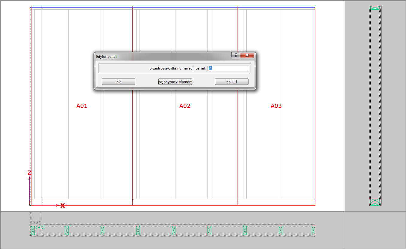 System numeracji paneli składa się z przedrostka w formie litery oraz dwucyfrowego numeru np. A01. Kolejność nadawania numerów jest związana z kolejnością wskazywania punktów podziału. Istnieje możliwość zmiany nadanych z automatu oznaczeń paneli w module konstrukcja ściany. Do tego celu służy komenda **7 system – 6 elementy – 1&#x20;*****renumeracja***. Funkcja umożliwia zmianę przedrostka oraz numerów nadanych panelom. Jeśli chcemy dokonać zmiany jedynie dla jednego lub kilku paneli należy wybrać opcję "***pojedynczy element**"*. W tym przypadku kontrolujemy dla wybranego panela zarówno przedrostek jak i jego numer. W przypadku renumeracji wszystkich paneli w obrębie ściany wybieramy opcję "***ok***" i wskazujemy panele. O wartości numeru decyduje kolejność wyboru paneli.