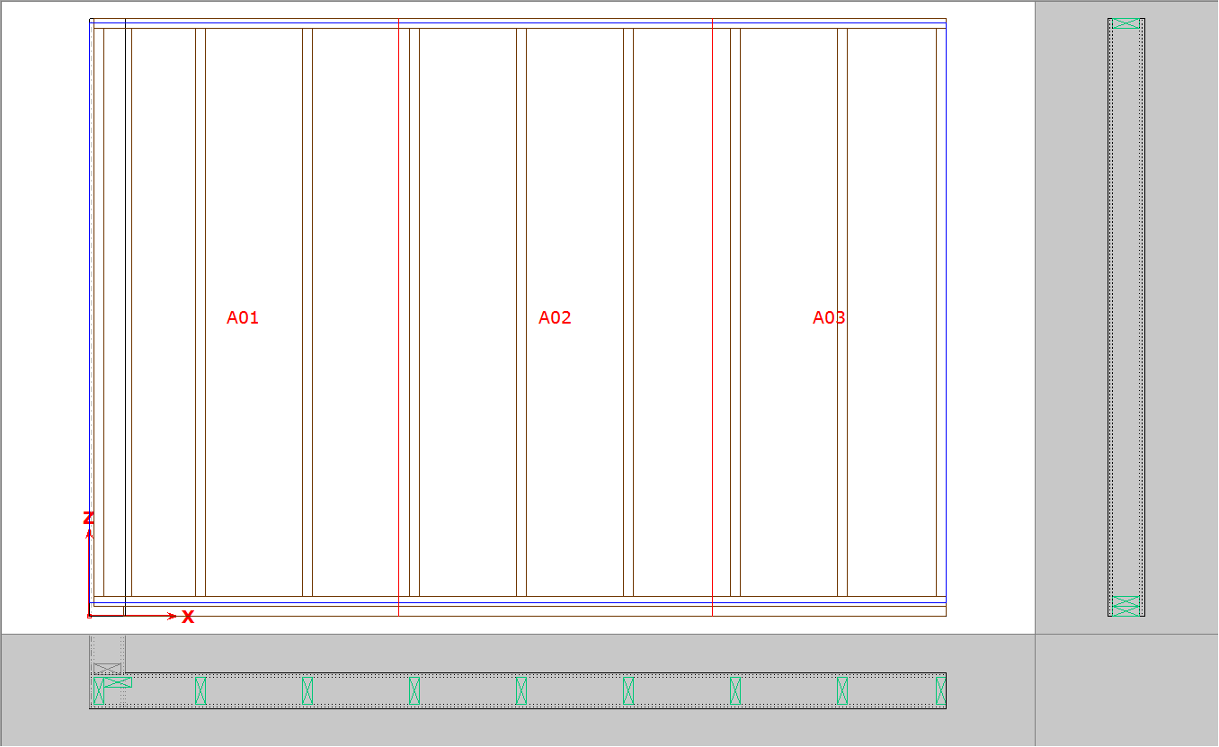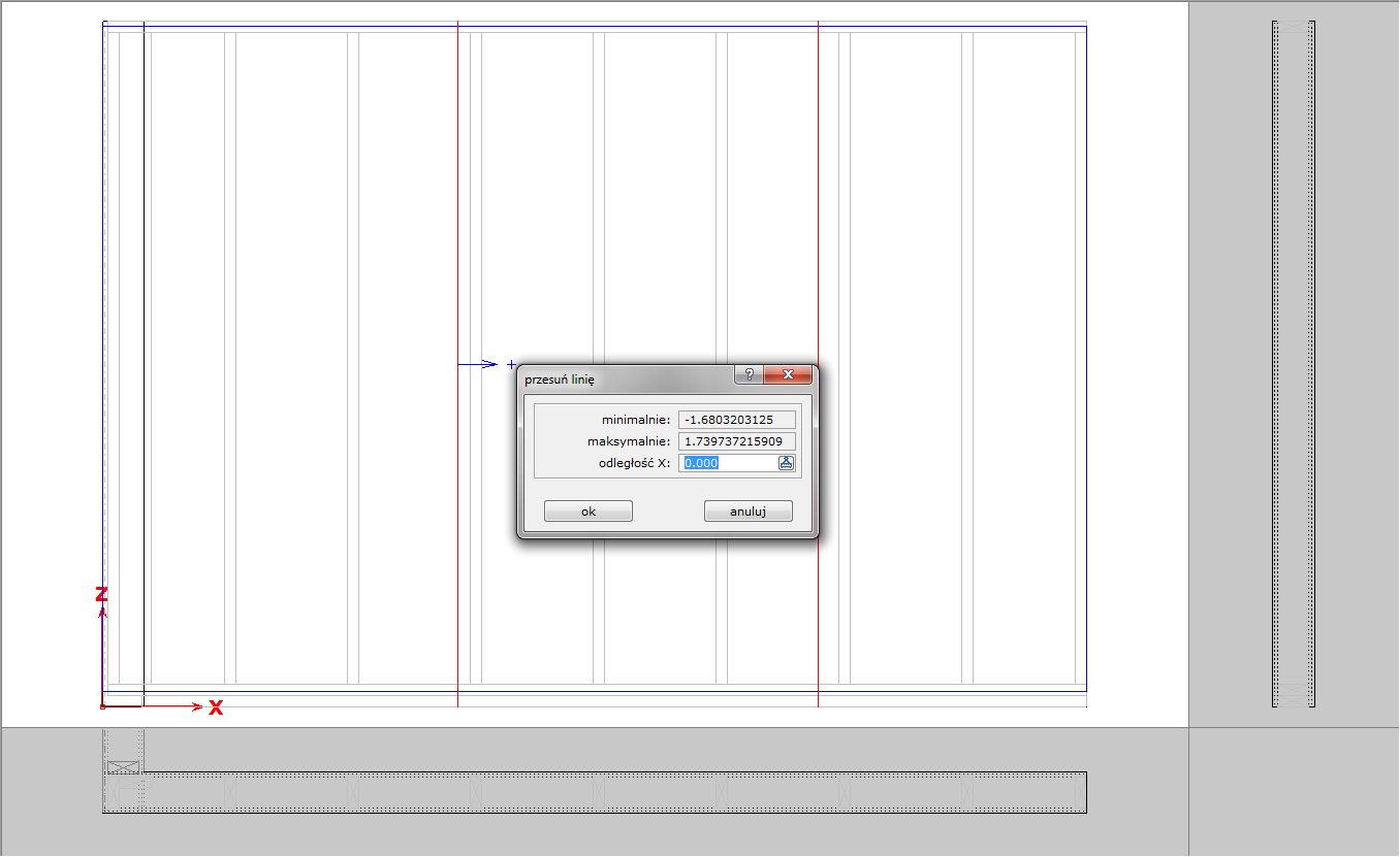 Punkty podziału ściany na panele określają ich wymiar. Zmiany wymiarów paneli można dokonać zmieniając położenie ich granicy za pomocą funkcji **7 system – 5 granice – 2&#x20;*****przesuń***. Metodą graficzną wskazujemy punkt podziału (czerwona linia), a następnie podajemy wartość przesunięcia.