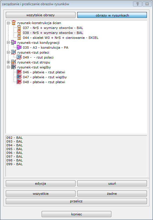 Daje ono możliwość kompleksowej aktualizacji wszystkich lub wybranych rysunków *dynamicznych*. Aktualizacja rysunków w programie **D-CAD** ma charakter bardziej lokalny. Zmiany mogą być realizowane jedynie w obrę­bie aktualnie edytowanego rysunku. Aktualizacja jednak obejmie wszystkie obrazy wykonane podczas operacji tworzenia danego rysunku. Na tym poziomie użytkownik ma możliwość kontroli nawet wybranych obrazów rysunków narzędziami z grupy *1 plik - 2* ***obraz rysunku***.