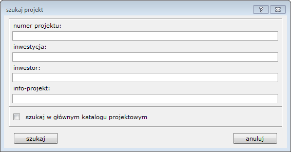 W nim oraz we wszystkich jego podkatalogach system dokona analizy informacji o katalogach projektowych według zadanych kryteriów. Kryteria ustalane są poprzez wywołanie funkcji **1 projekt - 7&#x20;*****szukaj***.