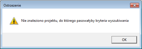 Przycisk ***szukaj*** rozpocznie proces wyszukiwania. Pozytywny wynik wyszukiwania spowoduje rozwinięcie i podświetlenie katalogu projektowego spełniającego kryteria. Odbędzie się to w tle za oknem narzędzia *szukaj projekt*. Jednocześnie system pozwoli na kontynuację analizy zawartości katalogu przyciskiem ***szukaj dalej*** w tym samym oknie. Jeśli nie występują w nim już projekty spełniające kryteria wyszukiwania system poinformuje o tym specjalnym komunikatem: