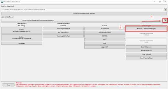 Baudatenprogramm starten -> 4-0 „Datenaustausch" -> Pfad zur neuen Materiallisteneinstellung auswählen.