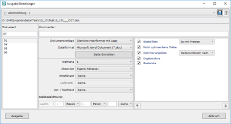 Nach einem Klick auf 'Ausgabe' in der Einstellungsdialogbox öffnet sich die Ausgabedialogbox: