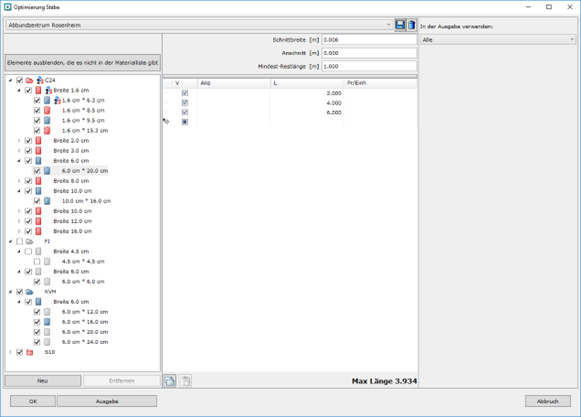 Die Optimierung erlaubt eine Längenoptimierung von Stäben, Profilstäben oder Platten. Speziell für Platten sei betont, dass es sich um eine Längenoptimierung handelt und nicht um eine klassische Plattenoptimierung. Es wird eine Platte hinter die Andere in eine Rohplatte gelegt, wie es für die 1.25m breiten Massivholzplatten gemacht wird. In der Regel wird die Optimierung allerdings für Stäbe oder Profilstäbe verwendet.