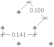 Les distances (X, Y) sont toujours appliquées dans la direction du repère actuel. Si le repère a été défini avec un angle, les distances de la trame ne sont plus parallèles et perpendiculaires au bord de l'écran. Exemple ci-dessous avec une distance de trame de 0.1m et un angle du repère = 45°. La distance entre deux points est de 1.141 si l’on mesure parallèlement aux bords de l’écran.