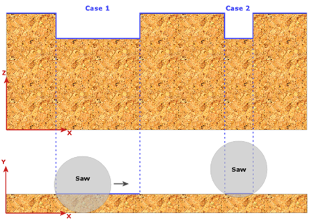 In 'Case 1' kann das Sägeblatt die Platte vollständig durchdringen. In 'Case 2' ist der Sägeschnitt zu kurz und die Säge kann die Platte nicht vollständig durchdringen, ohne gutes Material zu verletzen. Mit dem Sägeblattdurchmesser berechnet das Programm die maximal möglich Eindringtiefe und übergibt diese an die Maschine.