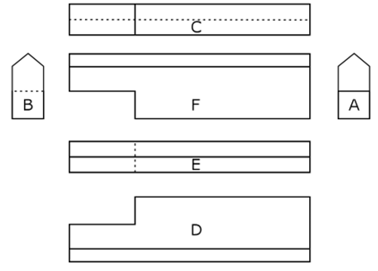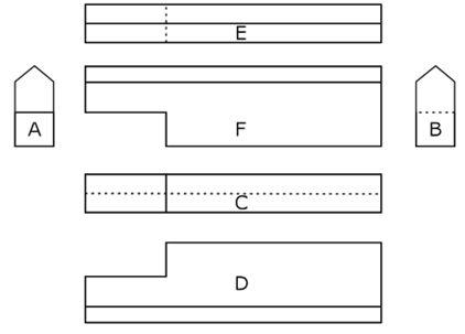 Épure du bâtiment pour les composants de charpente : Cette case permet d’ajouter une épure de repérage sur les fiches de taille des pièces de charpente. Les dimensions de l’épure de repérage peuvent être définies dans le champ "Taille de l’épure du bâtiment", situé à droite de cette même fenêtre. L’épure de repérage montre la vue de dessus du toit et de tous les composants dont le numéro courant correspond à la barre sur le dessin. Selon le composant, il peut s'agir d'un seul composant ou de plusieurs composants.