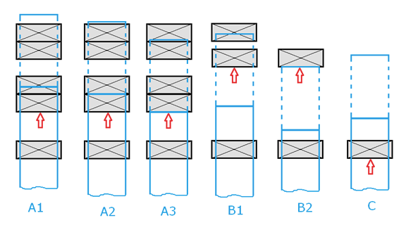 A1, A2, A3 : Dès que l'extrémité de la barre à connecter (barre 1) traverse un composant ou affleure celui-ci, la connexion s'effectue à cet endroit. Un composant plus éloigné est ignoré. Dès qu'un composant a été trouvé, le programme continue à rechercher si un autre composant répond à la règle. C'est pourquoi, dans les cas A1 et A2, le raccordement ne se fait pas au sommet des deux lisses, mais le programme continue à rechercher la deuxième lisse et y effectue le raccordement.